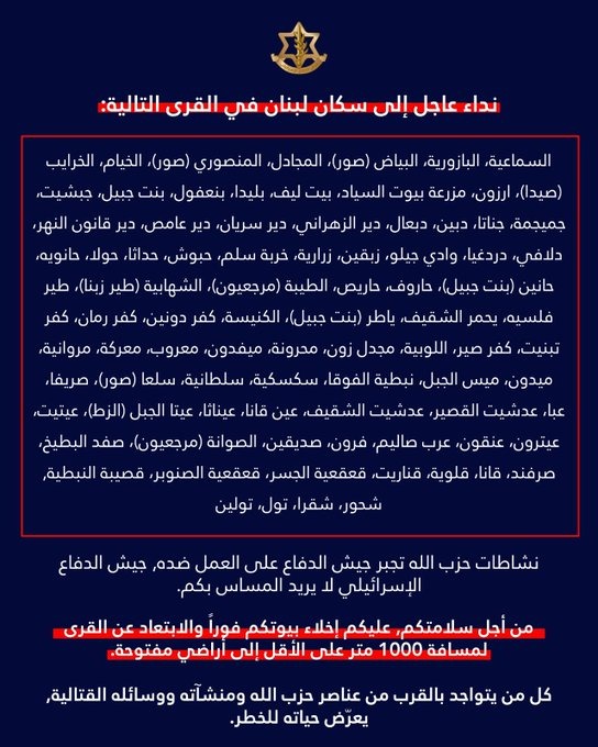 انذار عاجل إلى سكان لبنان، إليكم قائمة القرى والبلدات التي تم تحذيرها ونطلب منكم عدم العودة اليها: