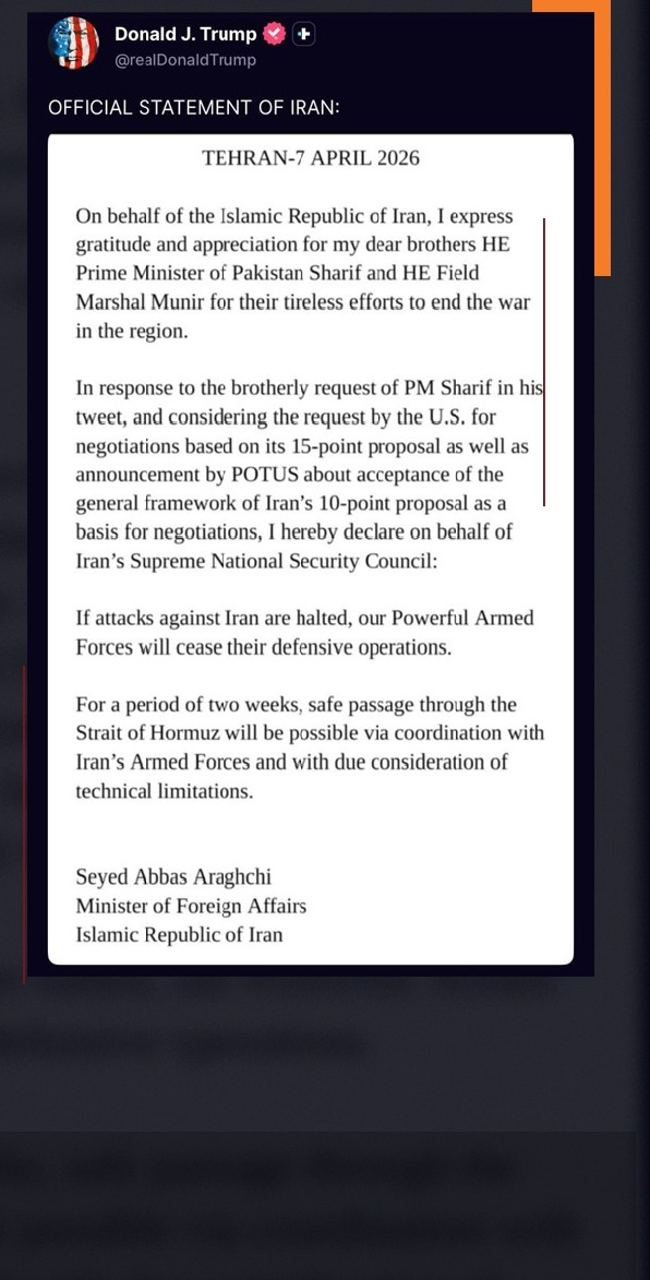 شارك الرئيس الأميركي دونالد ترامب منشور لوزير الخارجية الإيراني عباس عراقتشي حول اتفاق وقف إطلاق النار على منصته "تروث سوشال".