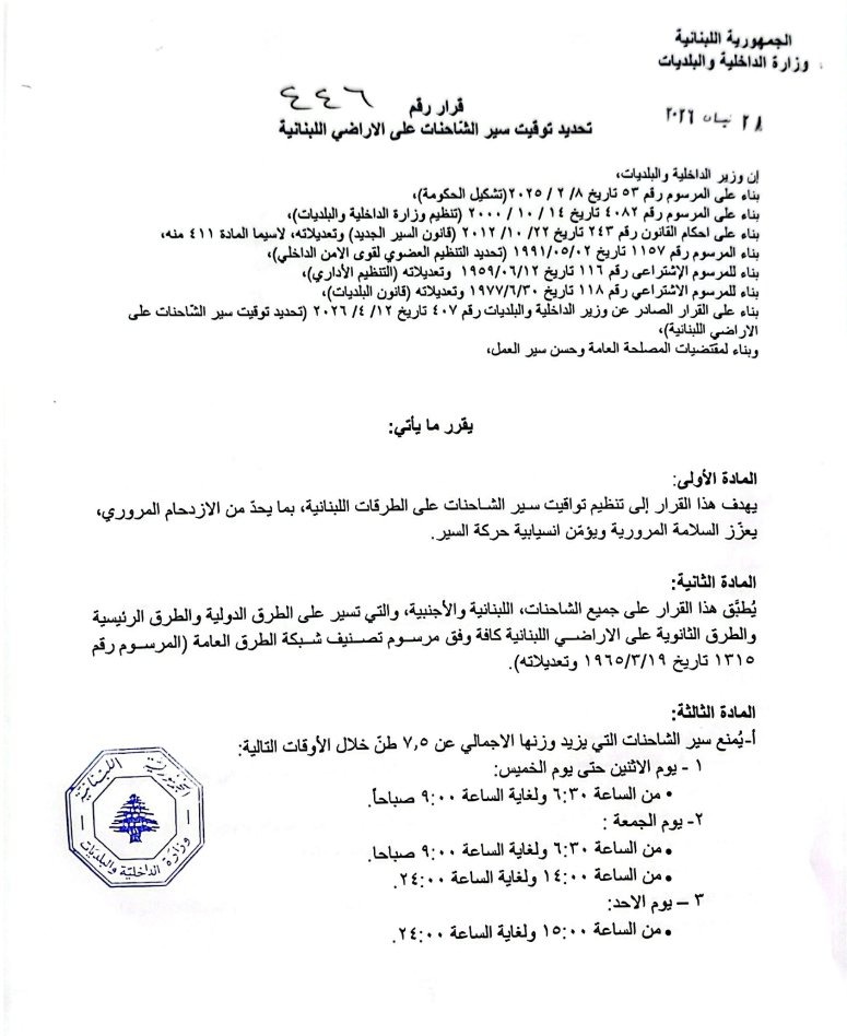 عممت وزارة الداخلية والبلديات القرار رقم أربعمئة وستةٍ وأربعين تاريخ الثامن والعشرين من نيسان 2026 حول تعديل توقيت سير الشاحنات على الأراضي اللبنانية.
