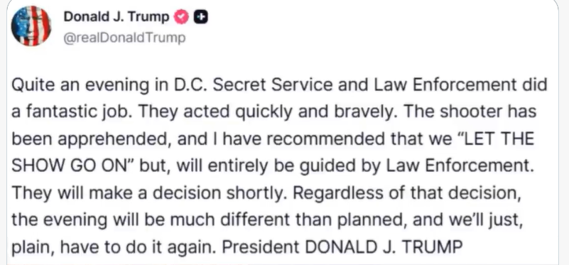 وقال ترامب في منشور عبر منصة “تروث سوشيال” إن “الليلة كانت صعبة في واشنطن، لكن عناصر الخدمة السرية تصرّفوا بسرعة وشجاعة”، مشيراً إلى أنه أوصى باستمرار الحفل، إلا أنه سيحترم بالكامل قرارات الجهات الأمنية التي ستُتخذ خلال وقت قصير.