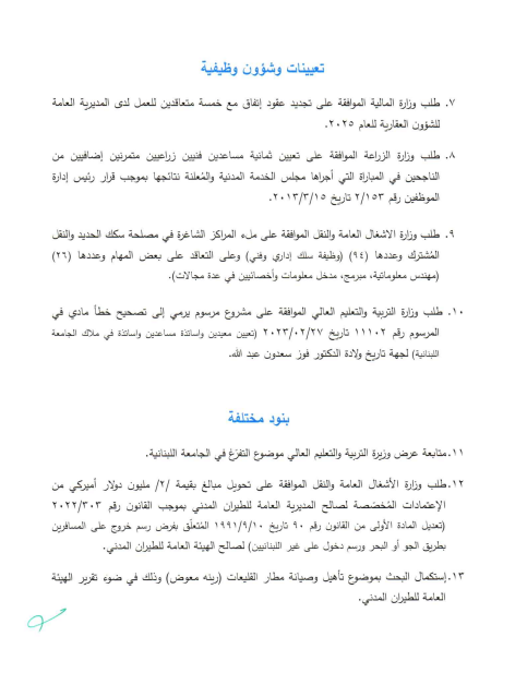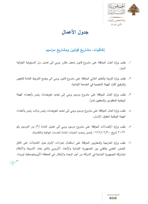 يعقد مجلس الوزراء، الثالثة من بعد ظهر بعد غد الجمعة، جلسة في السراي الحكومي.
