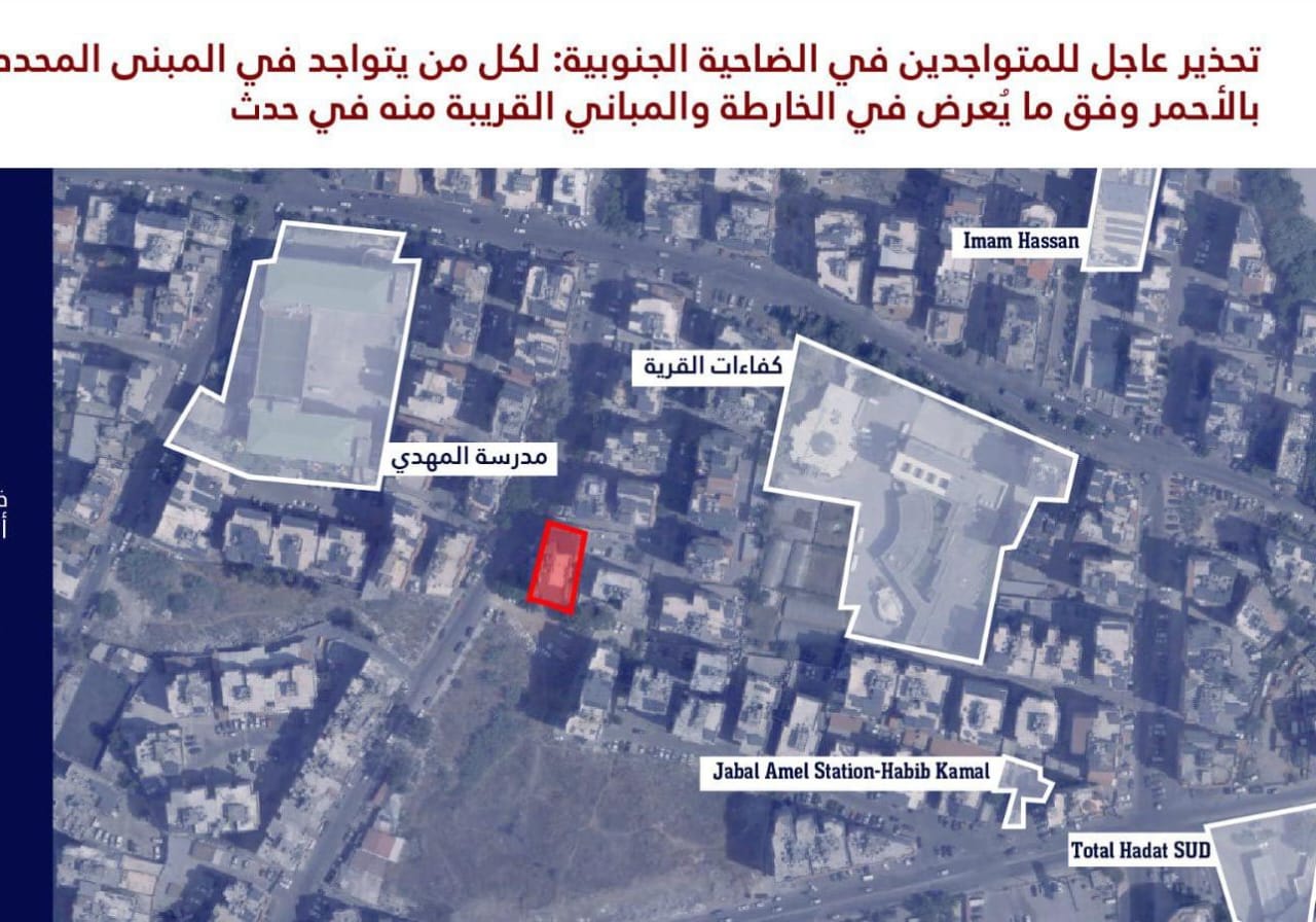 وجّه المتحدث باسم جيش العدو الاسرائيلي افيخاي ادرعي عبر حسابه على منصة اكس انذاراً إلى "جميع السكان المتواجدين في منطقة الضاحية الجنوبية وتحديدًا في المباني المحددة في الخرائط وتلك المجاورة لها في حارة حريك وحدث بيروت.