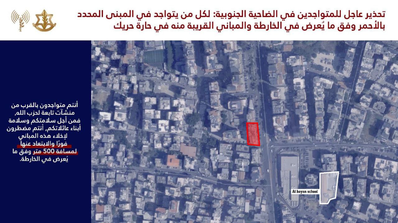 أصدر يصدر تهديدًا بالإخلاء لسكان حارة حريك والحدت في الضاحية الجنوبية لبيروت