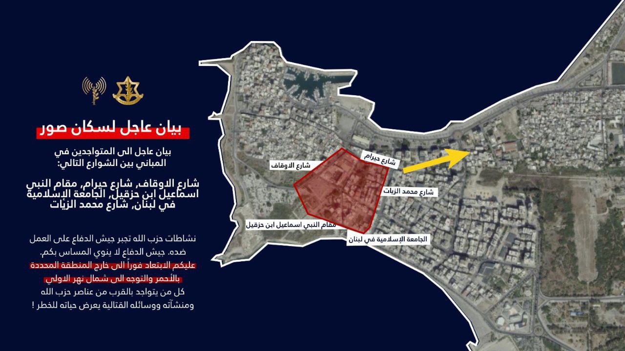 صدر بيان عاجل عن جيش العدو لسكان منطقة صور في لبنان وتحديدًا إلى المتواجدين في المباني بين الشوارع: *شارع الاوقاف, شارع حيرام, مقام النبي اسماعيل ابن حزقيل, الجامعة الإسلامية في لبنان، شارع محمد الزيات